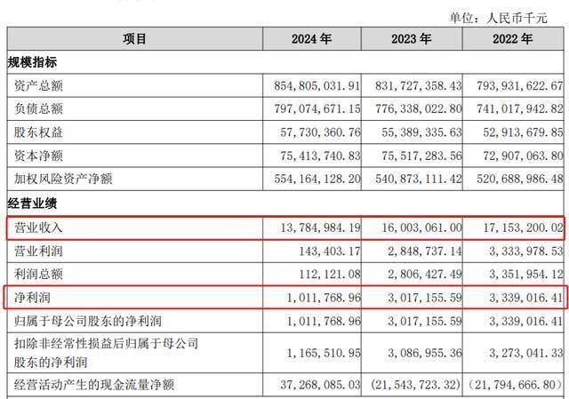 业绩方面,2021年-2023年,广州银行实现营业收入分别为165.64亿元、171.53亿元、160.03亿元;净利润分别为41.01亿元、33.39亿元、30.17亿元,净利两连降。