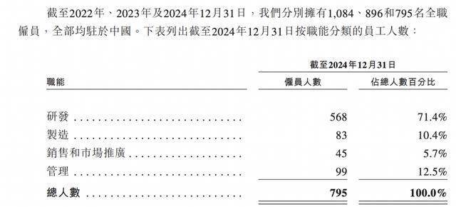 员工方面,截至2022年、2023年及2024年12月31日,福瑞泰克分别拥有1084、896和795名全职雇员,全部均驻于中国。其中,2024年末研发雇员568人,占比71.4%。
