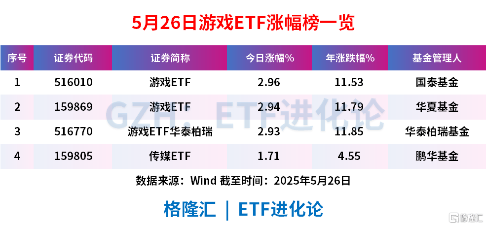 ETF方面,国泰基金游戏ETF、华夏基金游戏ETF、游戏ETF华泰柏瑞分别涨2.96%、2.94%和2.93%。