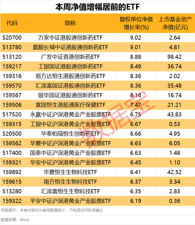 本周(5月19日至23日),创新药、黄金主题ETF单位净值增幅居前;受益于全球地缘冲突,资金加仓多只国防军工ETF。此外,七部门出台政策举措,加大对科技型企业的信贷支持,科创50ETF获得资金青睐。