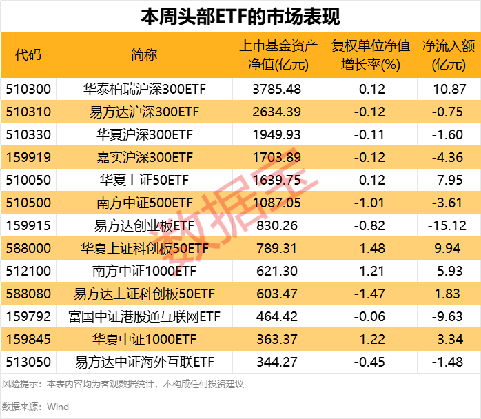 从头部ETF(最新资产净值300亿元以上)表现来看,单位净值普遍小幅走低。其中,华夏上证科创板50ETF、易方达上证科创板50ETF获资金净流入,金额分别为9.94亿元、1.83亿元。