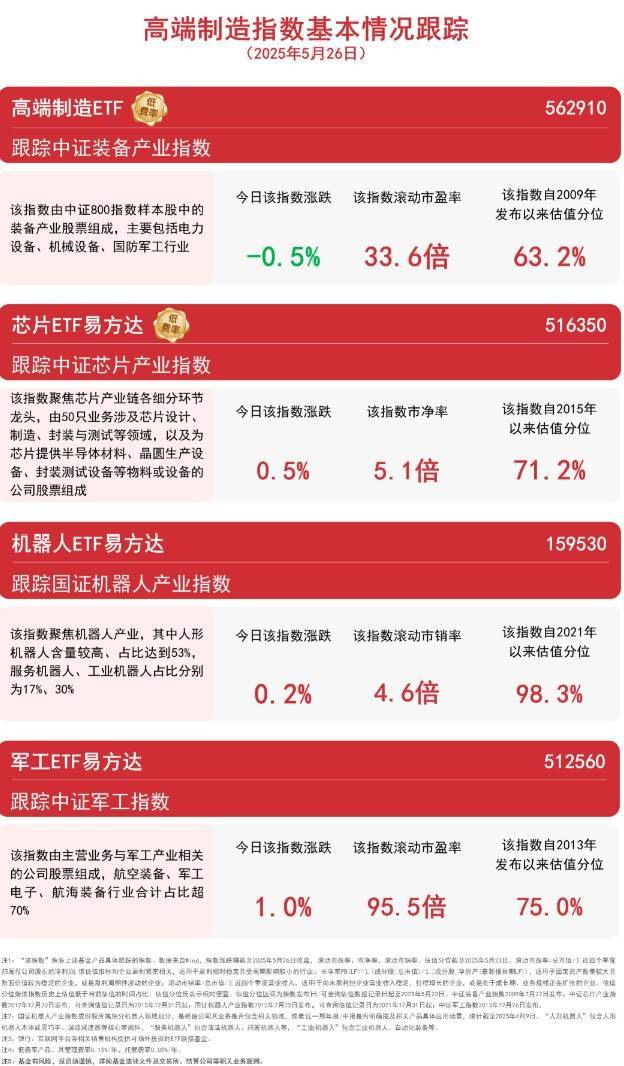 截至收盘,中证装备产业指数下跌0.5%,中证芯片产业指数上涨0.5%,国证机器人产业指数上涨0.2%,中证军工指数上涨1.0%。根据Wind数据统计,截至5月23日,机器人ETF易方达(159530)连续5个交易日获资金净流入,合计金额超1.2亿元。