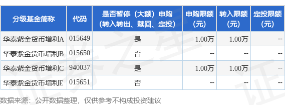 注:1、为维护基金份额持有人的利益,华泰紫金货币增利货币市场基金A份额及C份额限制中欧财富基金、同花顺基金、创金启富基金、众禄基金、好买基金、京东肯特瑞基金、度小满基金、玄元保险、长量基金、盈米基金、利得基金、云湾基金、奕丰基金单一账户单日申购及转换转入的金额为不超过1万元(含1万元)。