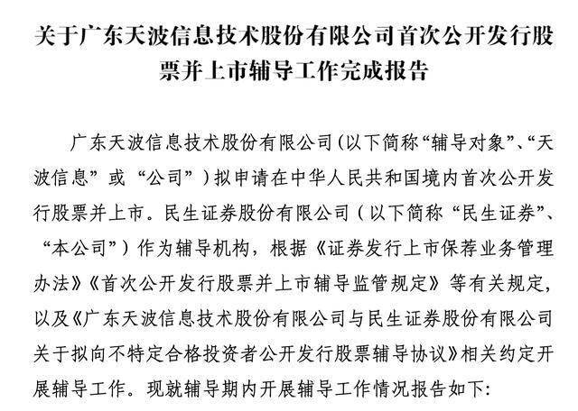 瑞财经 吴文婷近日,广东天波信息技术股份有限公司(以下简称“天波信息”) 披露北交所IPO辅导工作完成报告,辅导机构为民生证券股份有限公司。