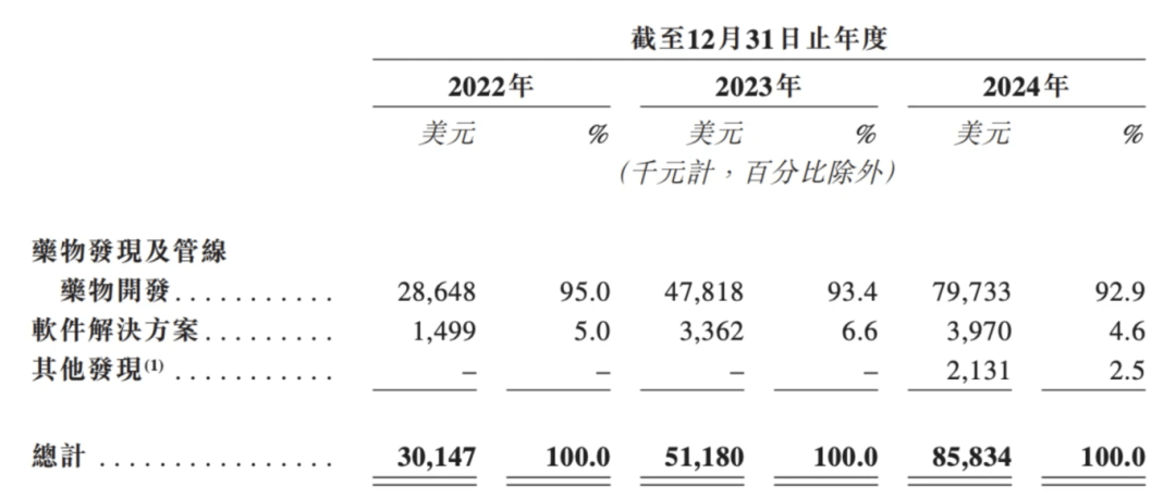 2022年到2024年,英矽智能的收入分别为3014.7万美元、5118.0万美元和8583.4万美元;2023年和2024年的营收增速分别为69.77%和67.71%。同期,英矽智能的药物研发与管线药物研发业务分别贡献2864.8万美元、4781.8万美元和7973.3万美元,分别占总营收的95%、93.4%和92.9%,可见英矽智能业务高度集中。