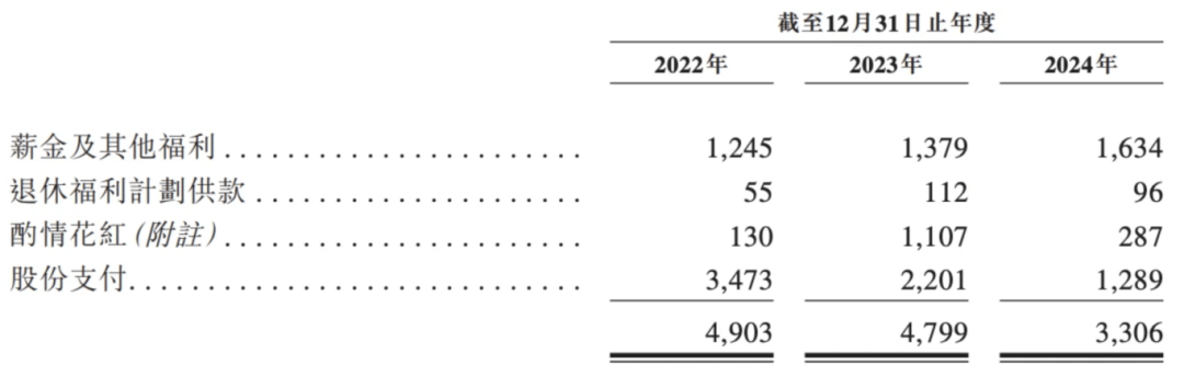 在英矽智能五名最高薪酬人士中,有两位董事,报告期内为其他三位最高薪酬员工发放490.3万美元479.9万美元和330.6万美元的薪酬。其中,虽然薪酬总额下降,但现金部分在增长,2023年和2024年薪金及其他福利分别增长10.76%和18.49%。
