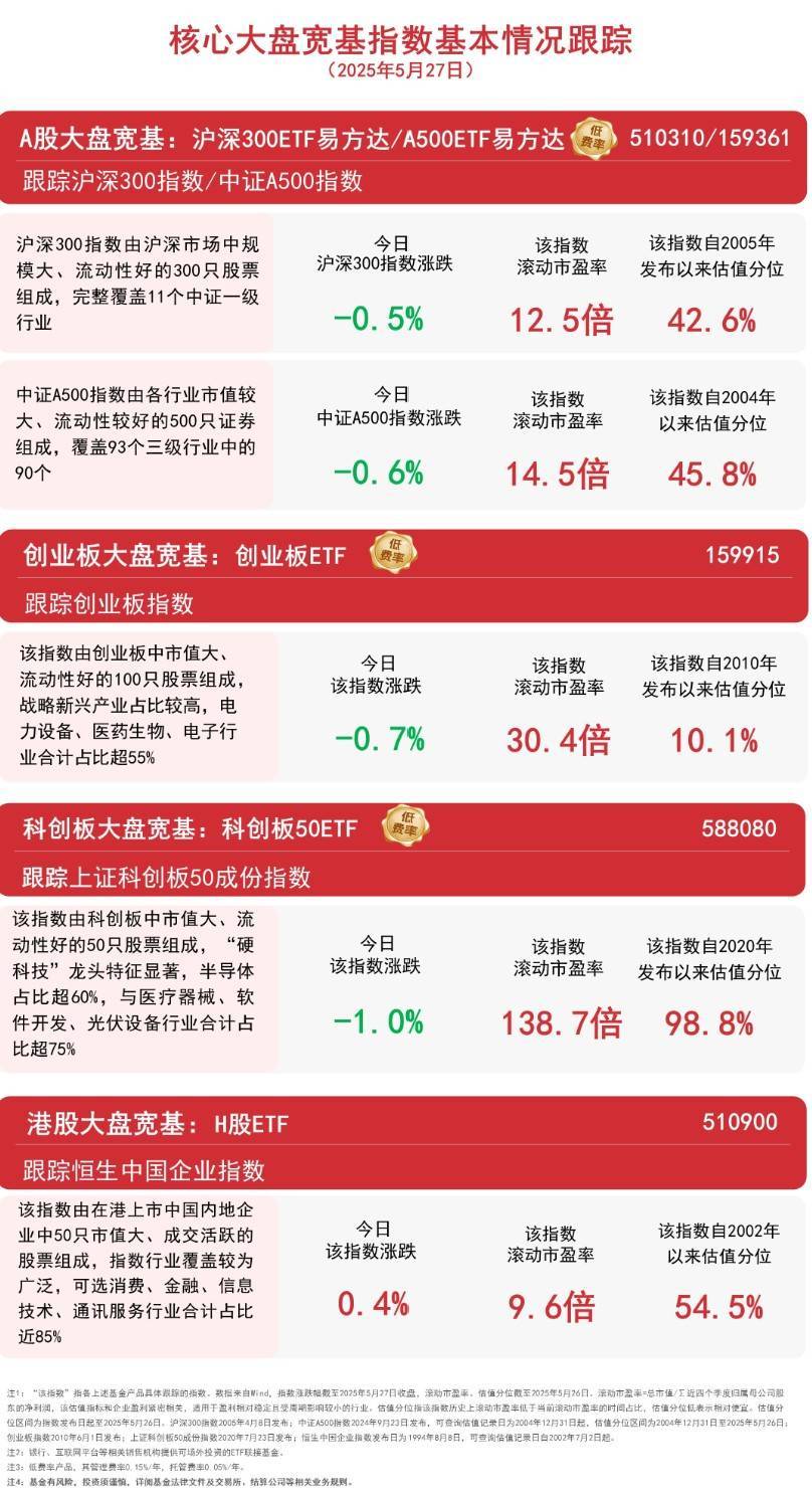 A股核心大盘宽基指数集体调整,板块方面,农药、饮料制品、代糖概念、CRO等板块涨幅居前,有色金属、CPO、消费电子、人形机器人等板块跌幅居前;港股午后走高,医药板块领涨。截至收盘,中证A500指数下跌0.6%,沪深300指数下跌0.5%,创业板指数下跌0.7%,上证科创板50成份指数下跌1.0%,恒生中国企业指数上涨0.4%。
