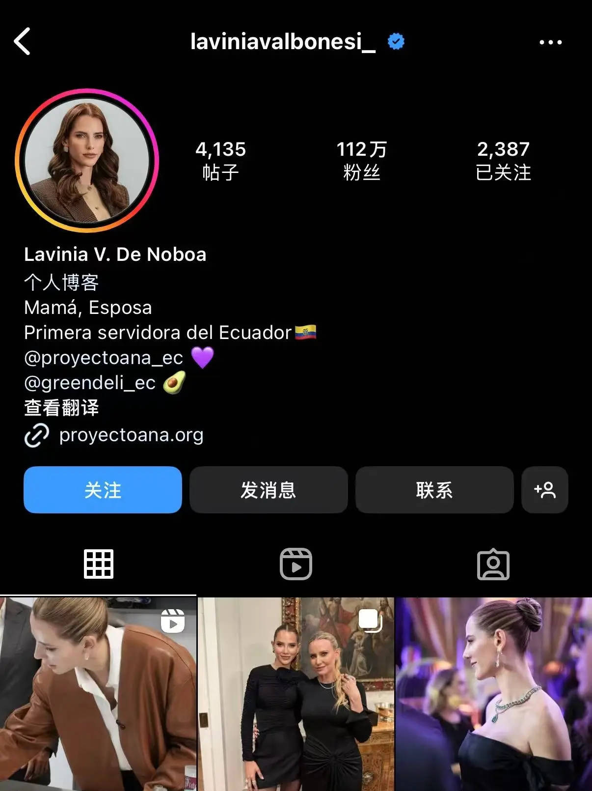 5月24日,厄瓜多尔总统丹尼尔·诺沃亚在首都基多国民议会宣誓就职,开始其第一个完整任期。在诺沃亚的就职典礼上,第一夫人拉维尼娅·瓦尔博内西闪亮登场,一身珠光白色的迪奥套装尽显优雅端庄,她的光芒甚至隐隐盖过诺沃亚。厄瓜多尔媒体也常常称她是她的丈夫能够当选总统的重要助力。