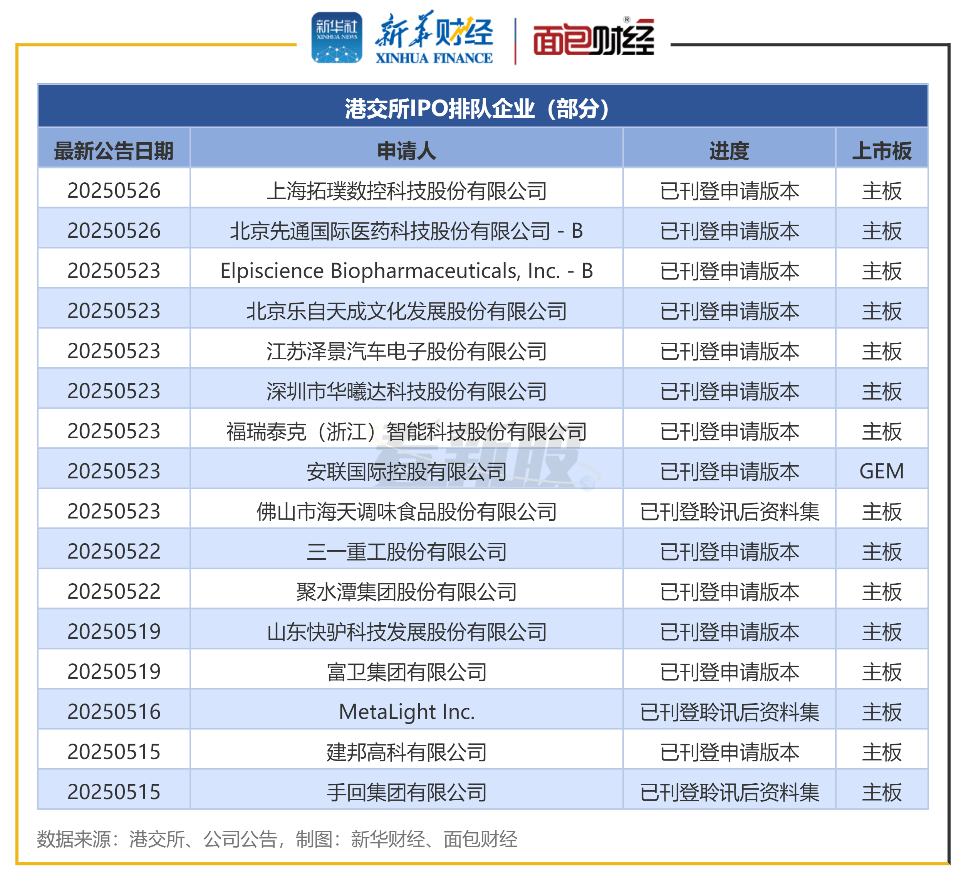 新华财经和面包财经研究员根据香港交易所披露信息,对港股IPO排队及新上市企业进行了梳理统计。其中,IPO排队企业选取依据为审核状态为已刊登申请版本、已刊登聆讯后资料集。