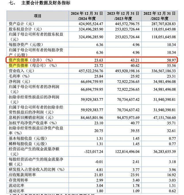据招股书,2022年-2024年,豪德数控实现营收分别为3.37亿元、4.94亿元、4.58亿元;归母净利润分别为3498.15万元、7292.22万元、6669.48万元。2024年出现营收净利双下滑,资产负债率由上年的43.21%降至23.63%。