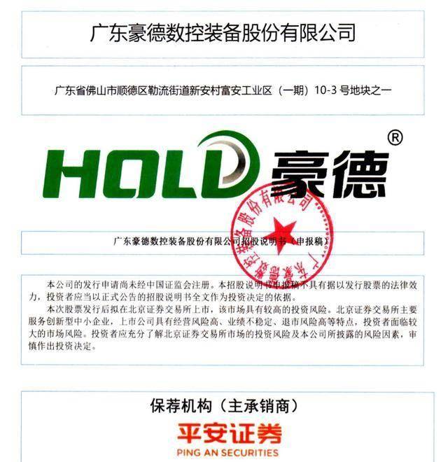 瑞财经 吴文婷 5月26日,广东豪德数控装备股份有限公司(以下简称“豪德数控”)北交所IPO已获受理,保荐机构为平安证券股份有限公司,保荐代表人为陈曦、赵堃,会计师事务所为容诚会计师事务所(特殊普通合伙)。