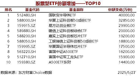 每经AI快讯,据东方财富Choice数据统计,昨日共12只股票型ETF当日份额增加超1亿份,国联安半导体ETF增加4亿份,华夏上证科创板50成份ETF增加3.29亿份。