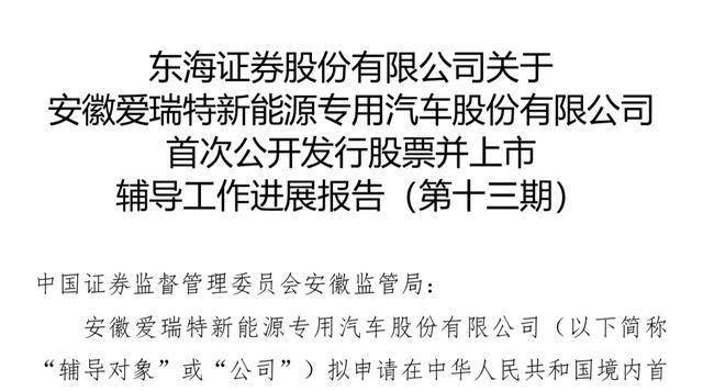 瑞财经 严明会近日,安徽爱瑞特新能源专用汽车股份有限公司(以下简称:爱瑞特)披露IPO辅导工作进展报告(第十三期),辅导机构东海证券。