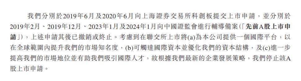 值得注意的是,公司分别于2019年6月及2020年6月向上交所科创板提交上市申请,并分别于2019年2月、2019年12月、2023年1月及2024年1月向中国证监会进行辅导备案,上述申请其后已撤销或终止。