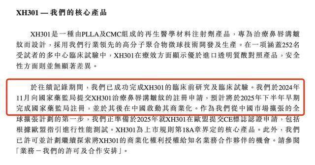 截至招股书披露日,妍美生物拥有13款主要再生医学材料注射剂候选产品,包括核心产品XH301,该款产品专为治疗鼻唇沟皱纹而设计,医美市场上常称作“童颜针”。