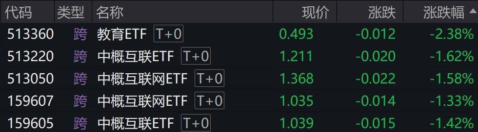 受盘面影响,教育ETF跌超2%,中概互联相关ETF跌约1.5%。