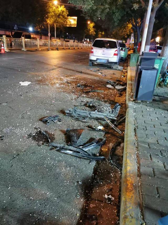 28 日凌晨,记者抵达现场时,中央护栏虽已经重新摆放归位,但其中数节有明显的撞击痕迹,甚至残缺。路面虽已清理干净,但对向人行道周围十余米范围内仍散落着大量玻璃、塑料、金属碎片。人行道上整齐地摆放着沿街商铺的桌椅,虽然已经深夜,仍有一些市民在此就餐。
