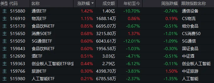 受上述板块提振,场内ETF中,食品饮料、消费50和酒等主题的产品,今天也小幅上涨。