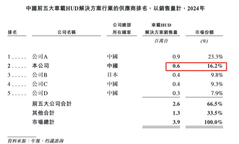 根据聆讯资料集披露,2024年,按销售量计算,中国前五大车载HUD解决方案供应商的市场份额达到66.5%。泽景电子在所有中国市场的车载HUD解决方案供应商中排名第二,市场份额约为16.2%。