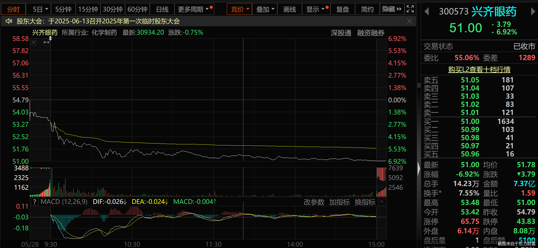 交易行情显示,5月28日,兴齐眼药低开2.5%,开盘后,公司股价不断下挫,截至收盘,兴齐眼药报51元/股,跌幅为6.92%,总市值为125.1亿元,全天成交金额约为7.37亿元,换手率为7.55%。