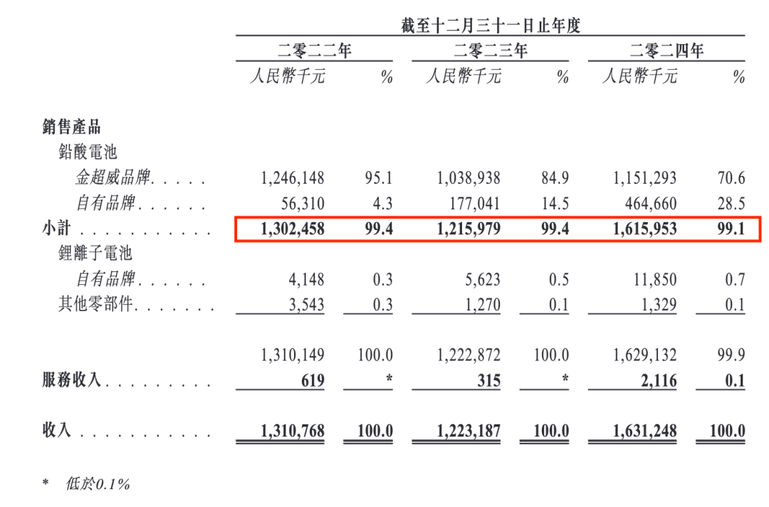 但按产品及品牌划分的收入结构来看,报告期内该公司销售铅酸电池的收入占比分别为99.4%、99.4%和99.1%,这一数据显示出他们的收入高度依赖单一产品。