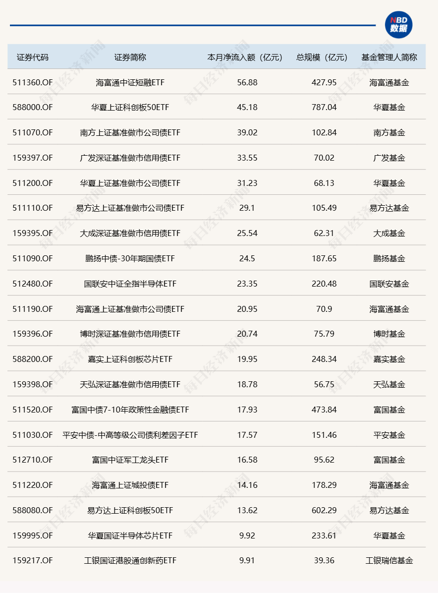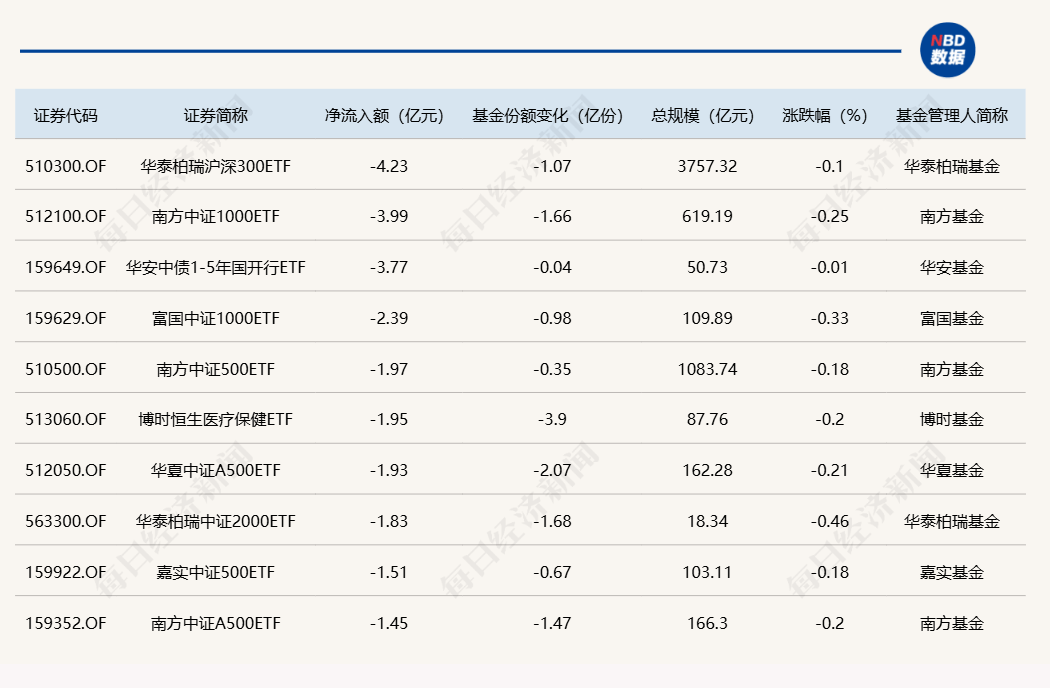与此同时,华泰柏瑞沪深300ETF基金份额减少1.07亿份,净流出额为4.23亿元;南方中证1000ETF份额减少1.66亿份,净流出额为3.99亿元;华安中债1-5年国开行ETF份额减少0.04亿份,净流出额为3.77亿元。