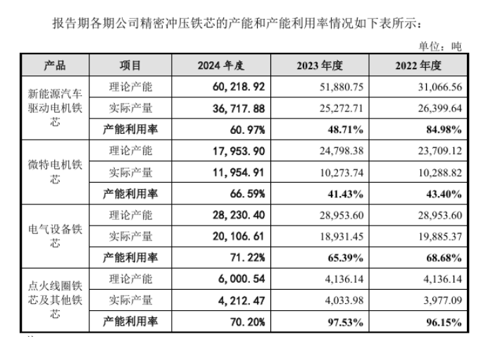 然而,从该公司主要产品的产能来看,利用率其实并不高。新能源车用驱动电机铁芯扩建项目是募资投入的重点,总计4.45亿元。但该公司在报告期内,新能源车用驱动电机铁芯的产能利用率却不高,2022年为84.8%,2023年降到了48.71%(产能利用率甚至不到一半),2024年略有回升,但也只有60.97%的产能利用率水平。该产品的产能利用率原本就不高,其继续大规模扩产扩建的必要性又来自哪里呢?近年来,高层一再强调要整治“内卷式”竞争,华新精科在新能源车用驱动电机铁芯项目上的继续投入是不是在加剧“内卷式”竞争,是不是在造成资源浪费呢?