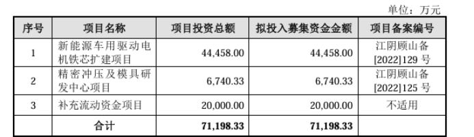 不仅如此,该公司的募投项目同样令人担忧。招股书显示,此次IPO,华新精科计划募集资金7.12亿元,其中4.45亿元将用于新能源车用驱动电机铁芯扩建项目,6740万元将用于精密冲压及模具研发中心项目,2亿元将用于补充流动资金项目。