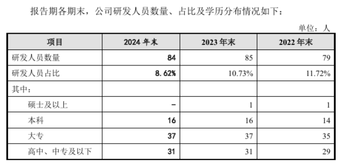 二是从研发人员的学历构成来看,在2024年末的84名研发人员中,竟然没有一名硕士及以上学历的研发人员,本科文凭的也只有16人,而大专生却多达37人,甚至高中、中专及以下学历人员也多达31人。这样的研发人员学历构成,实在是令人不敢恭维,让人不能不对该公司的发展后劲感到担忧。