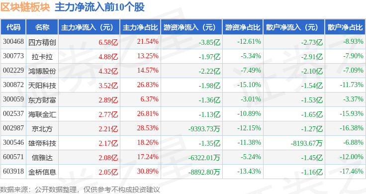 从资金流向上来看,当日区块链板块主力资金净流入74.58亿元,游资资金净流出34.82亿元,散户资金净流出39.76亿元。区块链板块个股资金流向见下表: