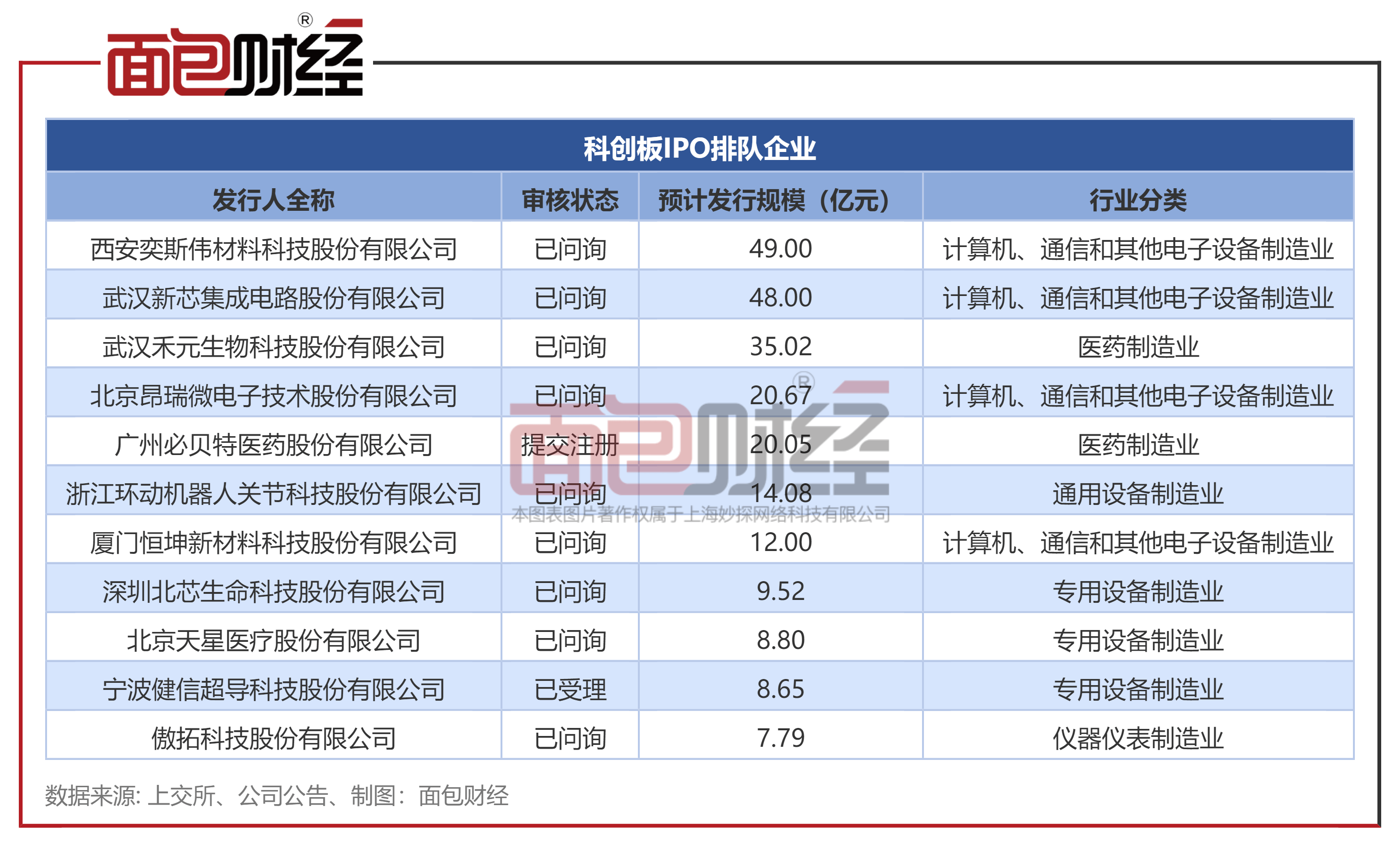 西安奕材、新芯股份的拟募资规模超过40亿元,规模相对靠前。此外,禾元生物、昂瑞微等5家公司的拟募资规模均超过10亿元。