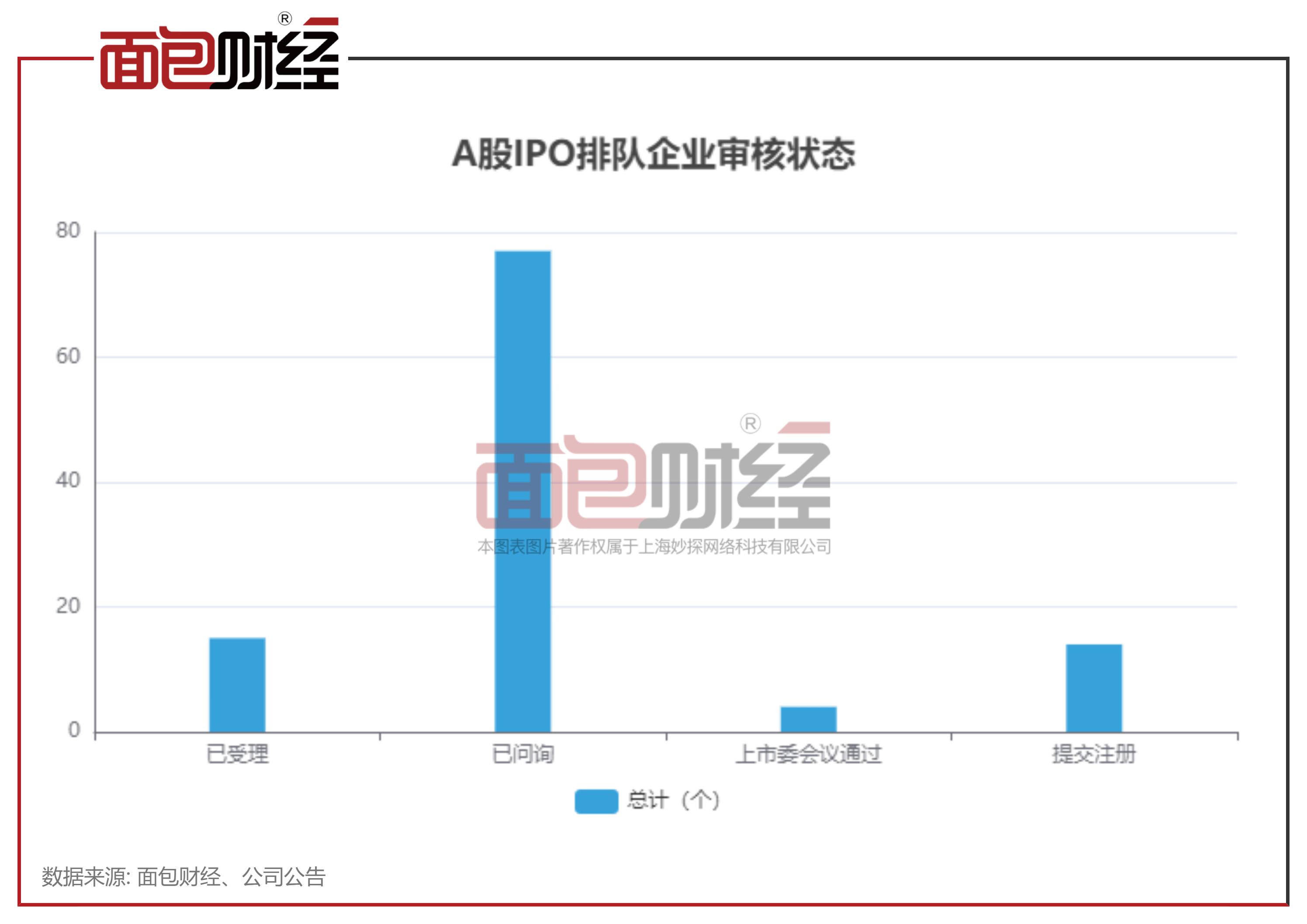 面包财经研究员根据沪、深、北交所披露信息,对A股IPO排队企业进行了梳理统计。其中,IPO排队企业选取依据为审核状态为已受理、已问询、上市委审议通过、提交注册。