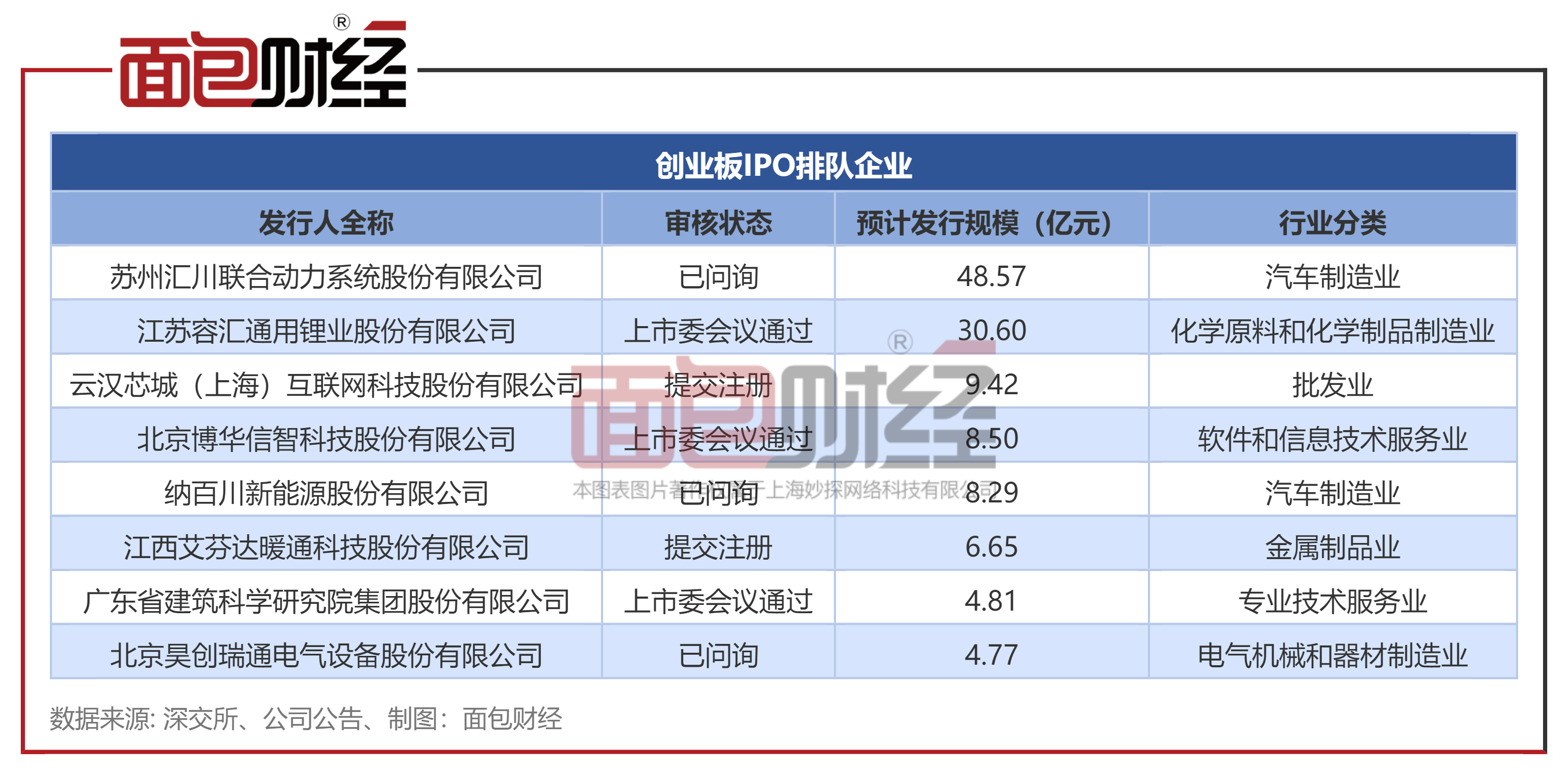 其中,创业板IPO排队企业共有8家,拟募集金额超120亿元。审批状态为已问询有3家、上市委会议通过有3家、提交注册有2家。