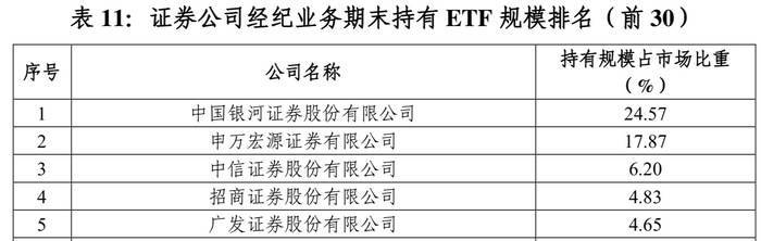 证券公司经纪业务持有的ETF规模集中度较高。从证券公司经纪业务期末持有ETF规模来看,银河证券以24.57%的沪市ETF持有份额问鼎榜首,申万宏源市场份额小幅下降,从3月份的19.71%降至17.87%,排名第二。中信证券、招商证券、广发证券分别以6.20%、4.83%和4.65%的市场份额紧随其后。