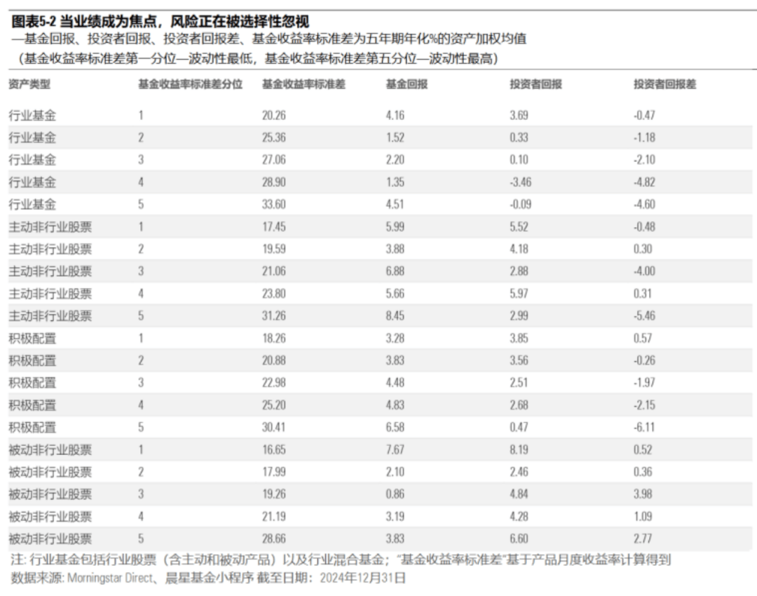 晨星研究发现,波动较低的偏债型产品回报差表现更优异。以债券作为底层资产,整体收益特征更为稳健,加之投资者选择此类产品多基于防御性考量,有助于降低投资者的短期交易冲动。