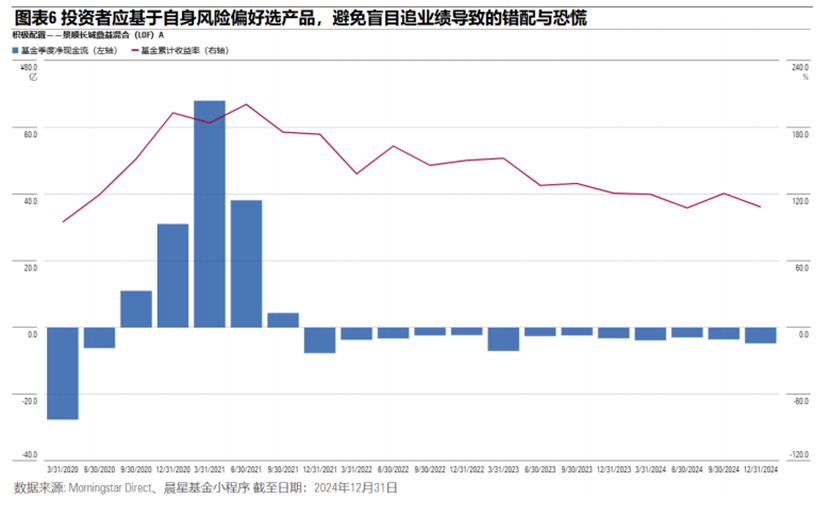 高昂的基金成本并没有带来更好的投资收益。根据晨星调研,长期看来,高费率与投资者频繁换手行为相叠加,严重影响了投资者最终收益,使得超额回报愈加困难。仍以长江长宏为例,2024年度收益为-7.15%,跑输基准20%以上。
