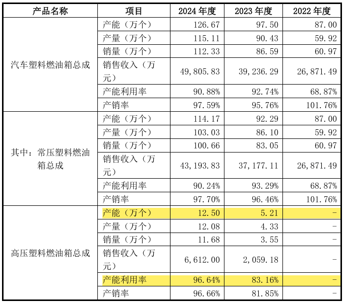 子公司浙江星昌,也就是本次募投项目的实际实施公司,从2023年8月起批量生产的高压塑料燃油箱设计产能为12.5万个/年。但实际上,按照实际生产月份加权计算的2023年实际产能为5.21万个/年,2024年的产能为12.5万个,产能利用率达到了96.64%。