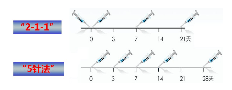 5针法:第0(注射当天)、3、7、14、28天,各接种1个剂量(儿童用量相同);