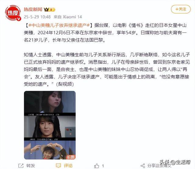 5月28日,据报道,以电影《情书》走红的日本女星中山美穗,2024年12月6日不幸在东京家中辞世,享年54岁。日媒称她与前夫育有一名21岁儿子,长年与父亲住在法国巴黎。