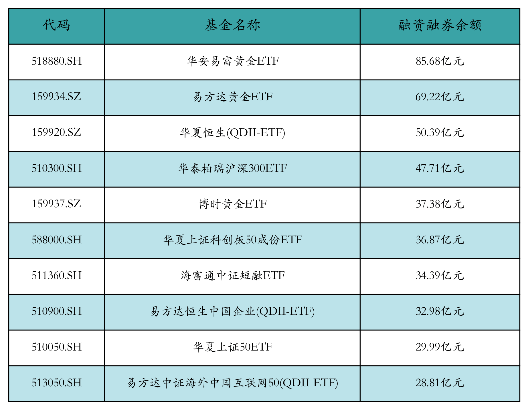 5月29日ETF两融余额前三位分别为:华安易富黄金ETF(85.68亿元)、易方达黄金ETF(69.22亿元)和华夏恒生(QDII-ETF)(50.39亿元),前10具体见下表: