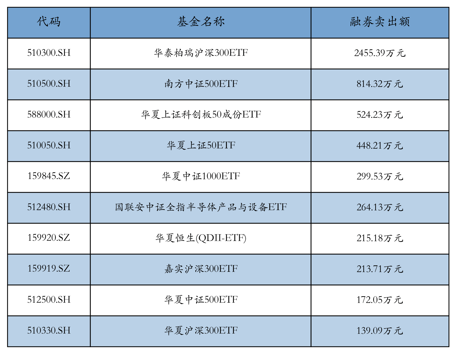 5月29日ETF融券卖出额前三位分别为:华泰柏瑞沪深300ETF(2455.39万元)、南方中证500ETF(814.32万元)和华夏上证科创板50成份ETF(524.23万元),前10具体见下表: