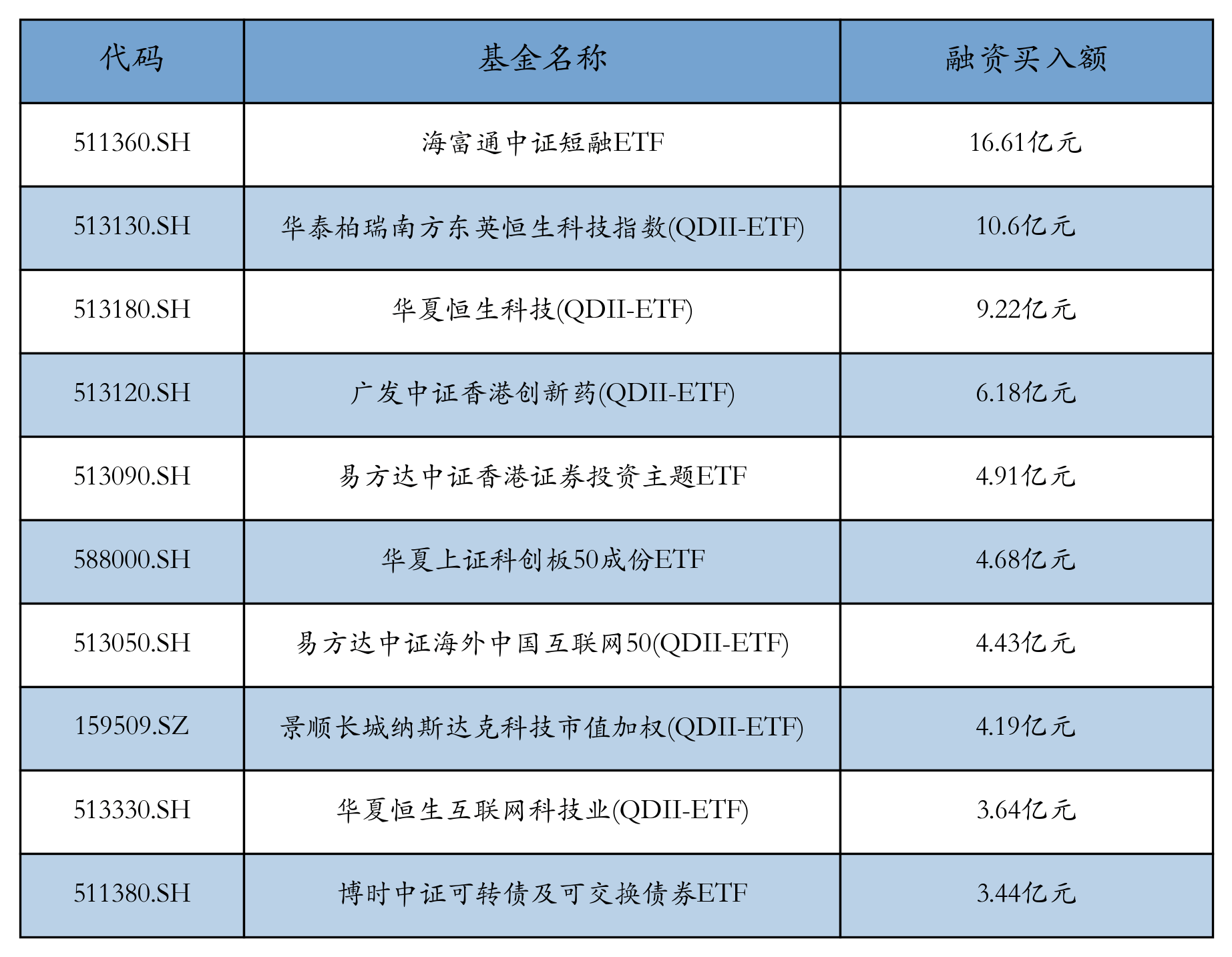 5月29日ETF融资买入额前三位分别为:海富通中证短融ETF(16.61亿元)、华泰柏瑞南方东英恒生科技指数(QDII-ETF)(10.6亿元)和华夏恒生科技(QDII-ETF)(9.22亿元),前10具体见下表:
