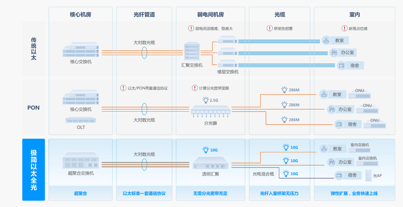 PON全光网络的出现,让业界看到了希望,并在短时间内得到部分市场的认可。但先“吃螃蟹”的园区网用户很快发现,新方案也带来了新烦恼:一张网涵盖以太和PON两种架构的协议,大幅提高运维难度和学习成本;分光、共享带宽的模式若遇到终端节点多、横向流量需求大的场景,资源无法有效分配;ONU的故障率高于企业级交换机,且出错原因庞杂,大规模应用会带来不可测的风险。