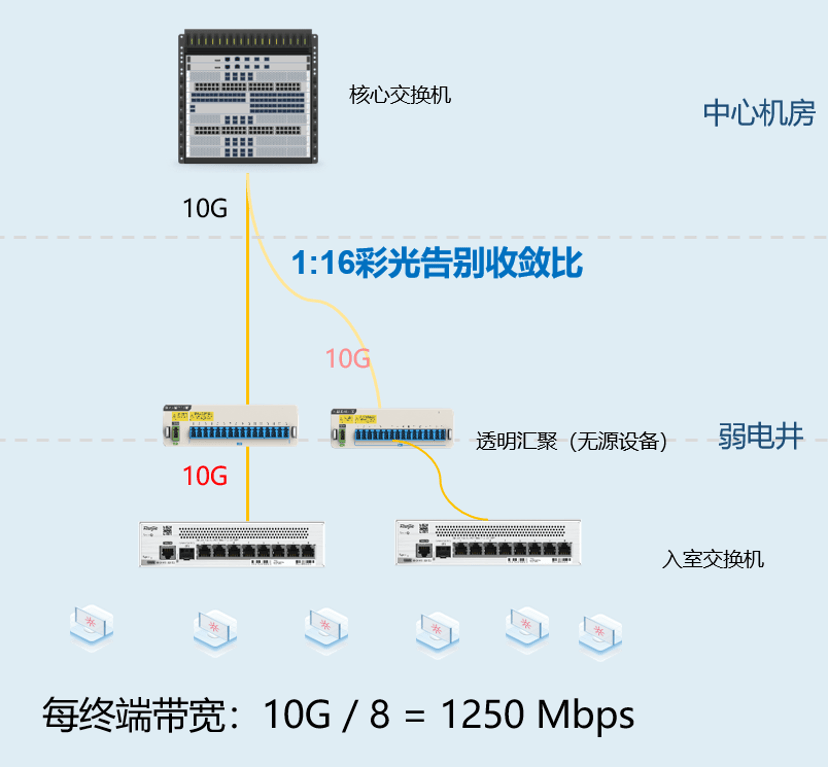 更令人担心的是,上述问题的负面影响在AI引领的新时代将变得尤为突出:在传输效率上,由于PON方案具有P2MP特性,实际达到每台网络终端的带宽甚至低于传统以太网,难以满足AI对高并发、高带宽的诉求;在网络架构上,PON方案仍采用“核心交换机-汇聚(OLT)-接入”三层架构,且需要不停进行协议转换,因此其时延无法有效降低。