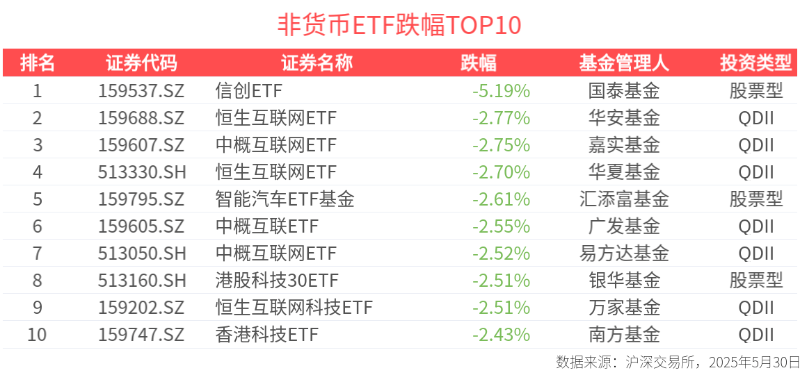 截至今日收盘,全市场共计901只非货ETF下跌,下跌比例达79%。行业主题指数方面,中证海外中国互联网50指数、中证香港科技指数跌幅居前,分别下跌2.55%、2.54%。
