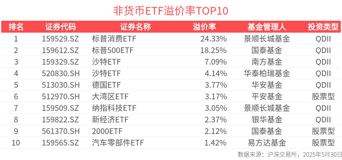截至今日收盘,标普500消费精选指数溢价居前,标普消费ETF收盘溢价24.33%;标普500指数情绪高涨,标普500ETF收盘溢价18.25%。