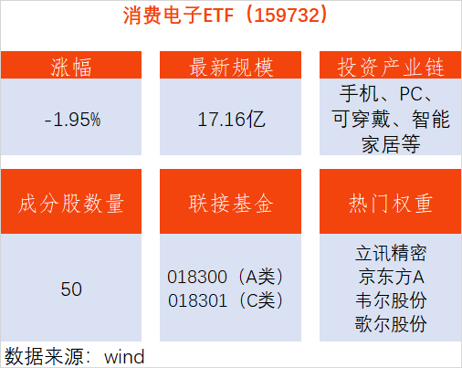 消费电子ETF(159732)跟踪国证消费电子指数,主要投资于业务涉及消费电子产业的50家A股上市公司,行业主要分布于电子制造、半导体、光学光电子等市场关注度较高的主流板块。其场外联接基金为,A类:018300;C类:018301。