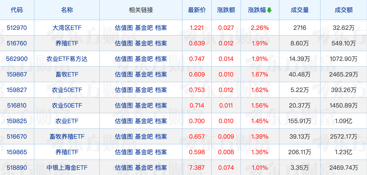 具体来看,大湾区ETF领涨2.26%;此外,养殖、畜牧、农业相关ETF集体走强。