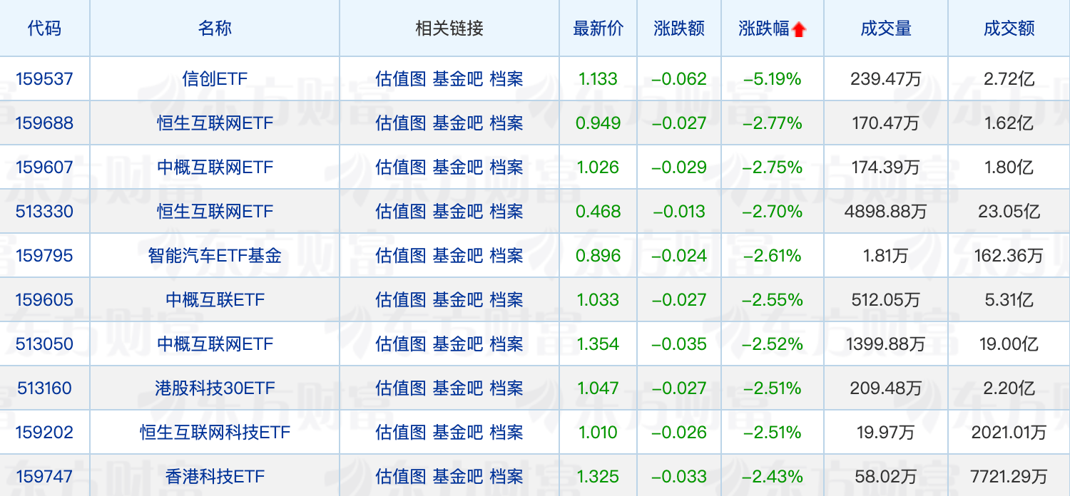 下跌方面,信创ETF领跌5.19%;此外,恒生互联网相关ETF集体回调。