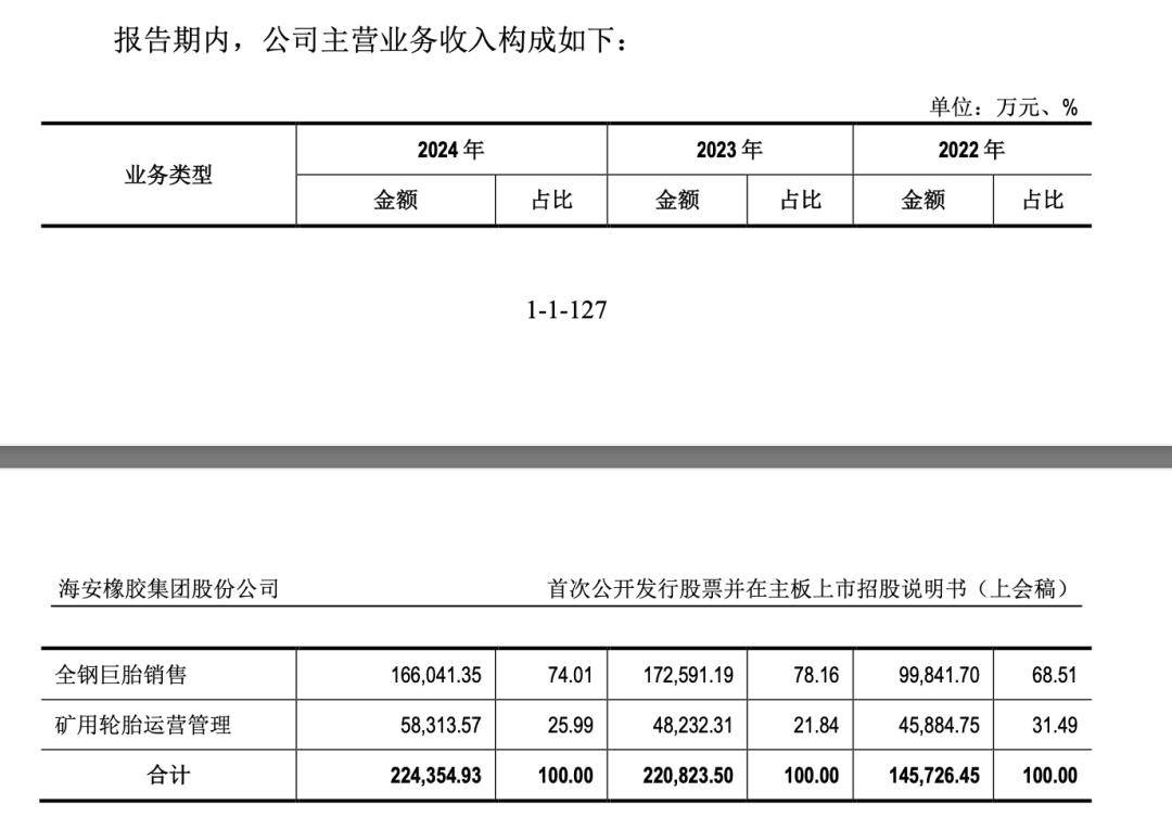 根据《招股书》可知,公司业务分为全钢巨胎销售业务、和矿用轮胎运营管理业务。全钢巨胎销售业务是海安橡胶的主要收入来源,2022年-2024年,该业务给公司带来的收入分别为9.98亿元、17.26亿元和16.6亿元,占营收的比例从68.51%上升至74.01%。